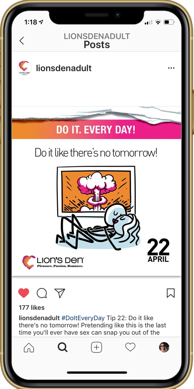 Through #LionsDen365, every day was a new way to make sexual wellness approachable. Humor and real talk normalized topics that typically make people hesitate to follow or share. A sub-campaign for Sexual Health Awareness Month dug deeper, sharing empowering insights and starting conversations around wellness and safety.